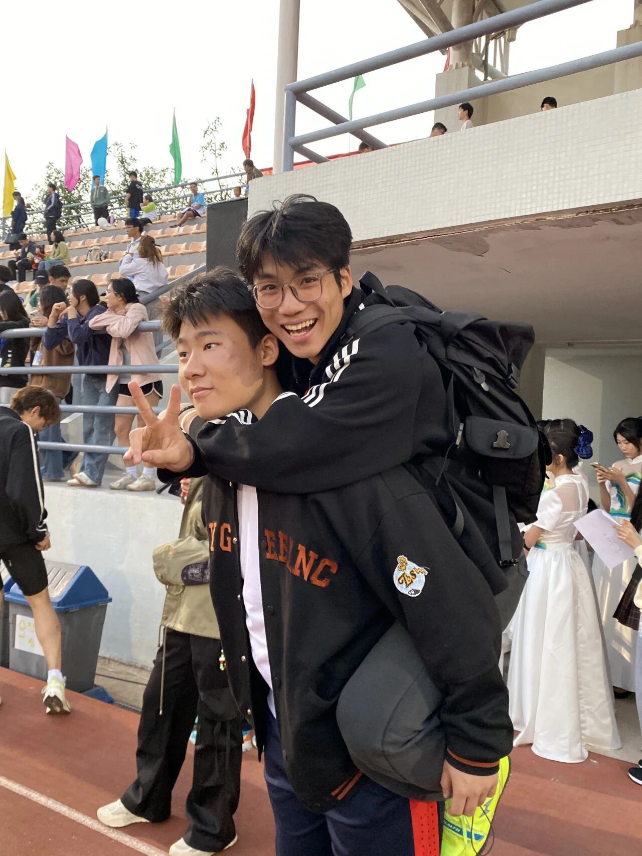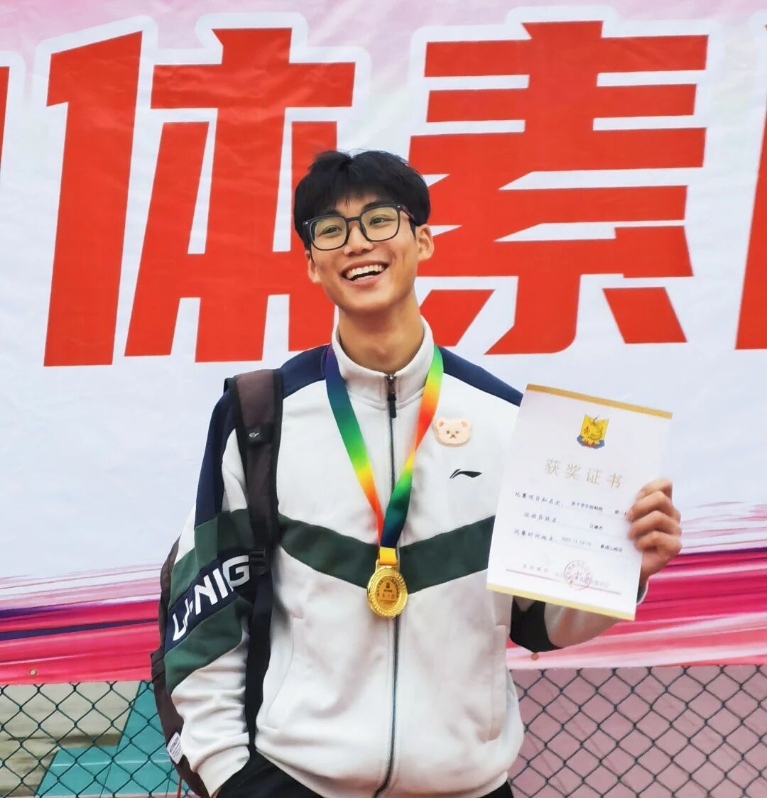 汪骏杰与体育的缘分,早在童年结下。在广西乡村长大的他,从小就在田野与树林间奔跑玩乐。武侠片里的侠客是他爱上体育运动的启蒙。“爷爷说我就像条‘蛆'一样好动,每天都在模仿武侠片里的招式,蛤蟆功、天残脚……还总是削木棍和竹子当武器。”汪骏杰回忆道。中学时期,他就是校园里的“运动达人”,在跳远、跳高等项目中屡获佳绩。这份对运动的喜爱与追求延续至今,成为他青春岁月里最鲜明的底色。