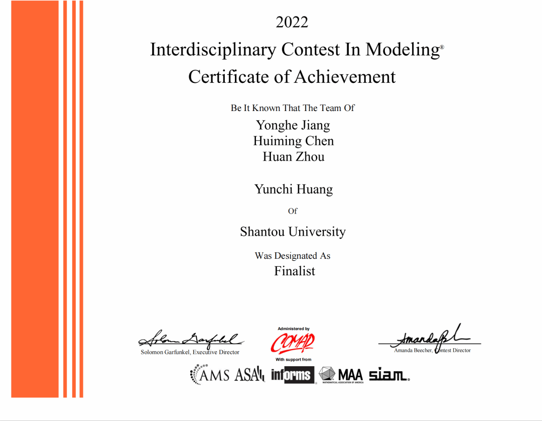 在备赛过程中,他们一起梳理完题型后,为各自分配好最擅长的题型进行训练,最大程度地发挥团队的优势。直到正式比赛,“我们发现那个题目所考察的算法与先前准备的算法有相似之处。”通过对问题的进一步分析,他们将先前准备过的算法与其他相关算法进行结合,事半功倍地完成了这次美赛的题目。“我们不是临场发挥,不是从零开始思考。”姜永赫表示。最终,他们获得2022年美国大学生数学建模竞赛特等奖提名奖。“我们都不敢相信这个结果是真的”,他激动地说。