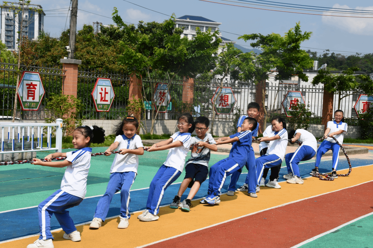 运动场上,“趣味运动会”点燃了盛夏的热情。“拔河力量大比拼”中,孩子们攥紧绳索齐声呐喊,小脸憋得通红却始终不松手;“珠行万里”游戏里,搭档间的步伐从踉跄到默契,失误了就笑着爬起来再来一次。加油声震彻操场,汗水浸湿衣衫,笑容却比阳光更灿烂。这场运动盛宴让孩子们在奔跑跳跃中强健了体魄,更在团队协作中懂得了“齐心才能赢”的道理。