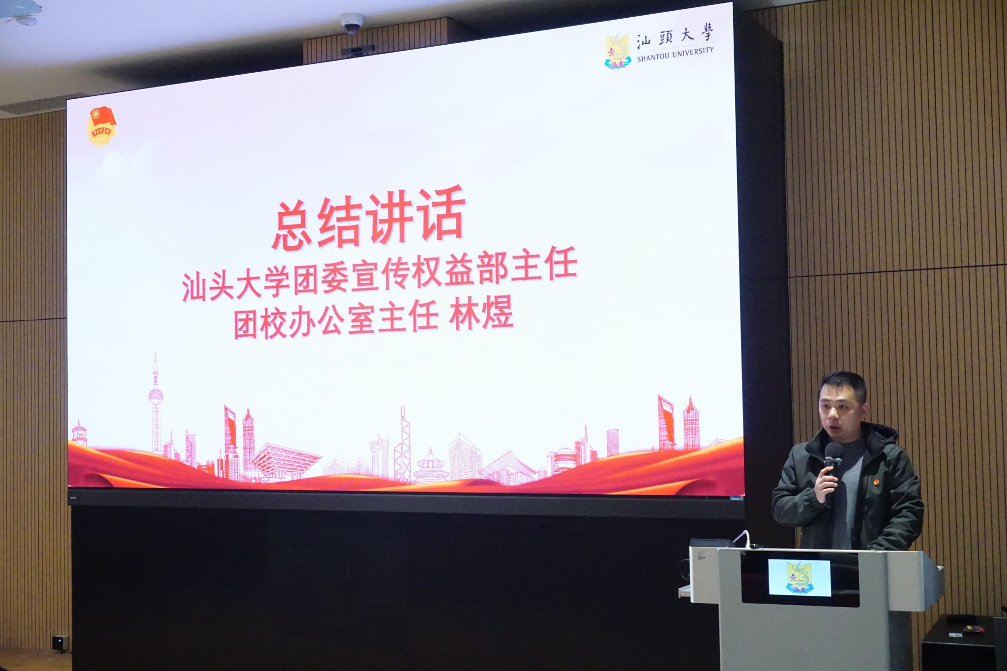 仪式上,林煜代表汕头大学团委和团校进行总结讲话。他首先开展“深入学习宣传贯彻党的二十届四中全会精神和《习近平谈治国理政》第五卷”专题培训。随后,他为本次培训班进行总结,对学员们在培训期间的表现和收获给予充分肯定,并提出三点希望:要坚守信仰之魂,做一个“明白人”;要锤炼过硬本领,做一个“实干家”;要永葆奋斗本色,做一个“追梦人”。他勉励同学们将培训班中所学所获内化于心、外化于行,积极投身于中华民族伟大复兴的壮阔征程。