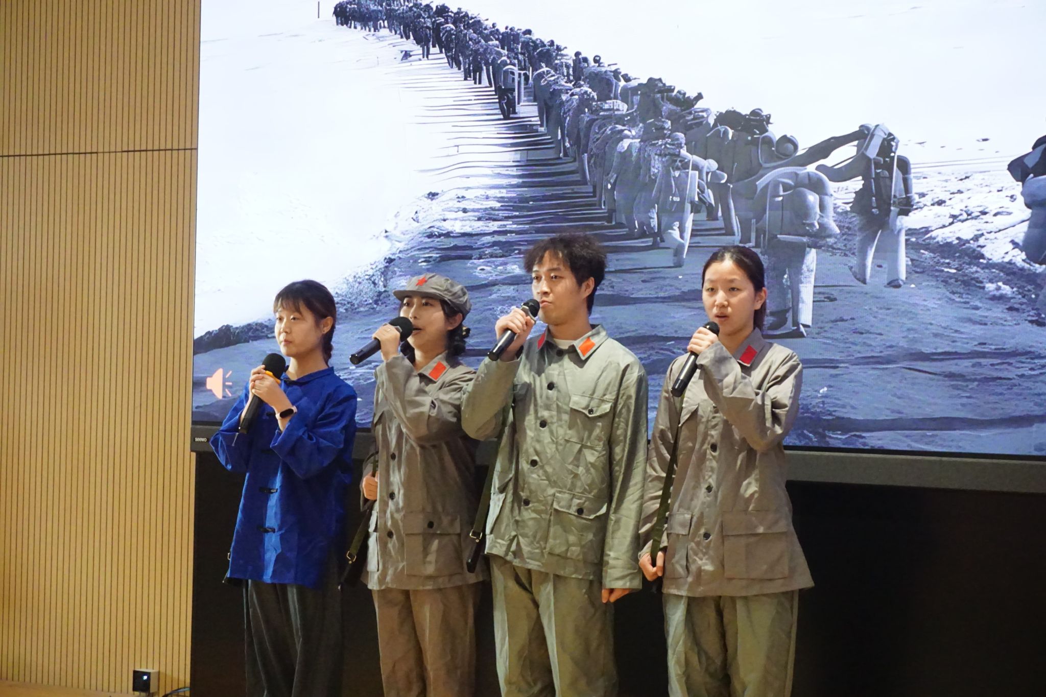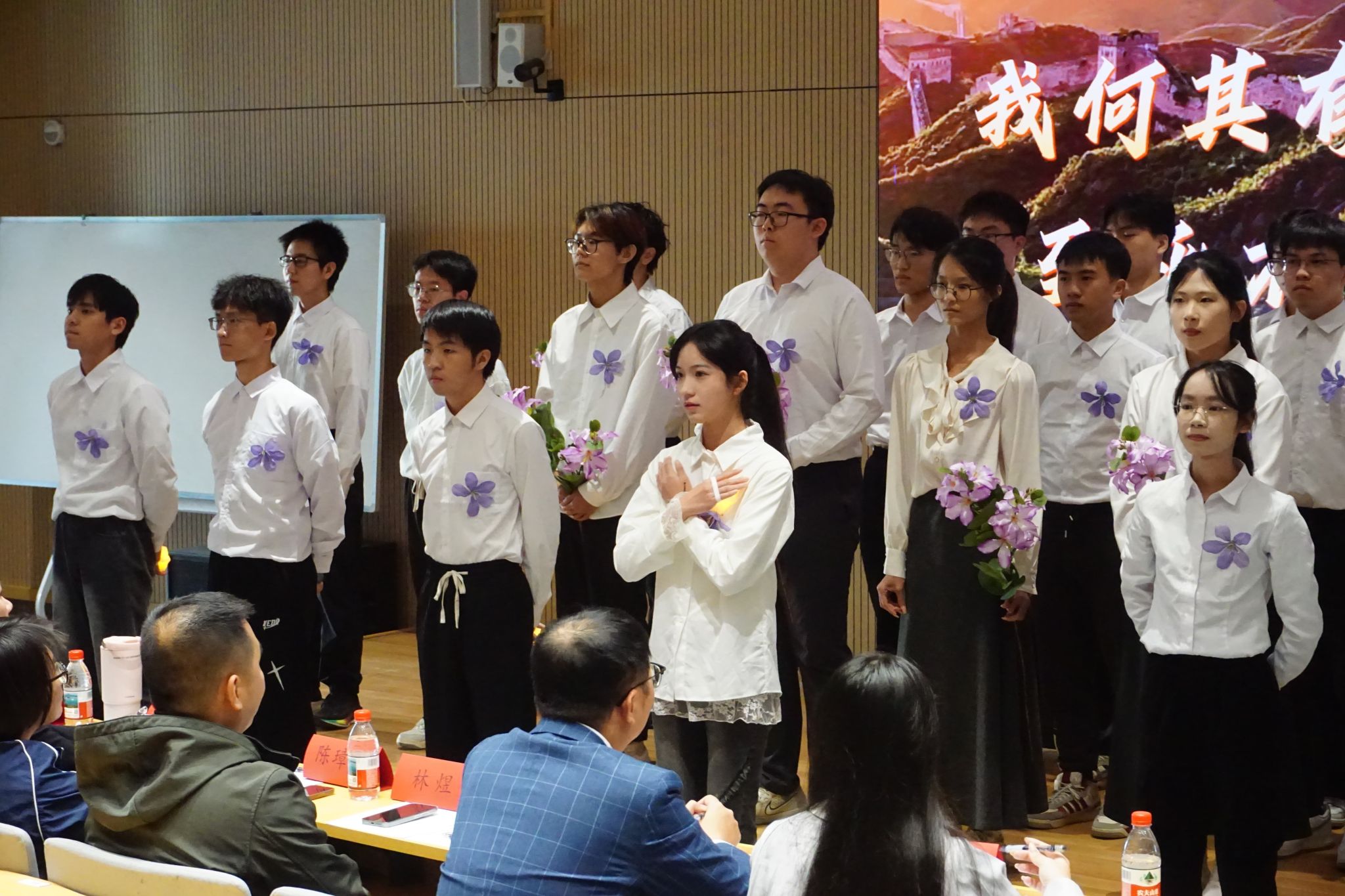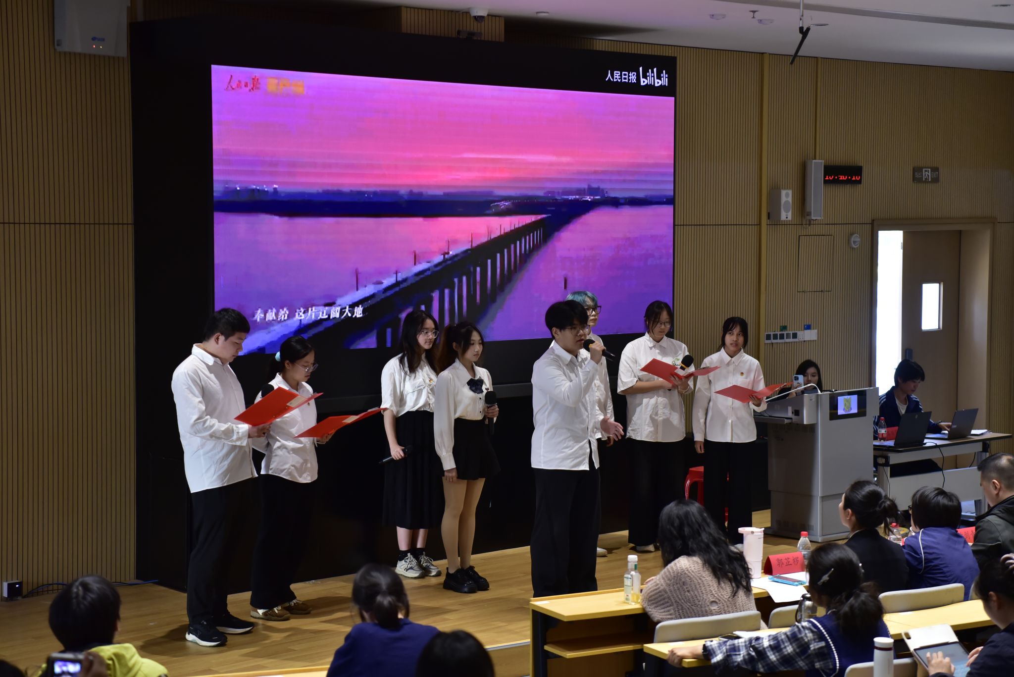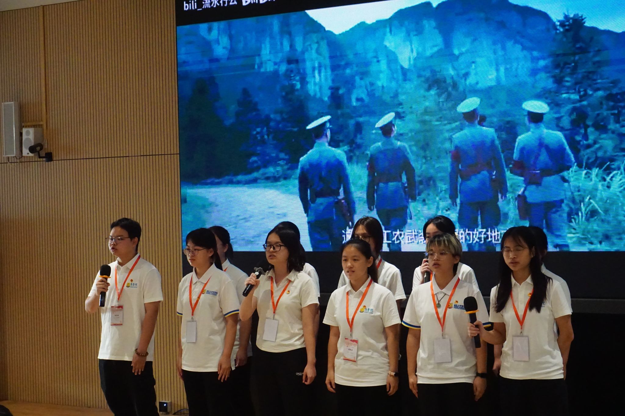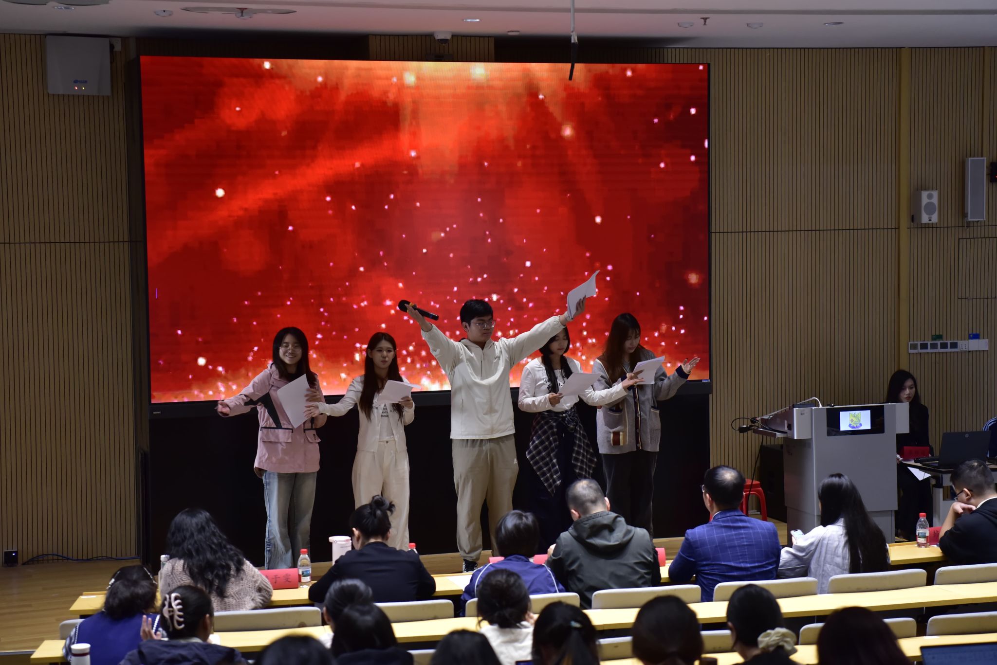 结业仪式上,各个团支部围绕“党的二十届四中全会精神”“伟大抗战精神的时代传承”“新时代青年担当”三个专题进行主题汇报表演,通过红色歌曲演唱、舞台剧表演、诗歌朗诵等方式汇报学习成果,并由各评委老师进行评分。