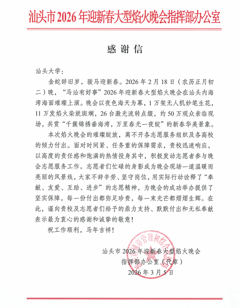 当万家团圆、灯火可亲之时,2026年汕头市迎新春大型焰火晚会在内海湾璀璨上演。近日,我们收到了汕头市2026年迎新春大型焰火晚会指挥部办公室的感谢信,原来,在这场视觉盛宴的背后,有一群年轻的身影默默坚守——他们就是来自汕头大学的志愿者,用奉献与热情,为晚会的顺利有序保驾护航。