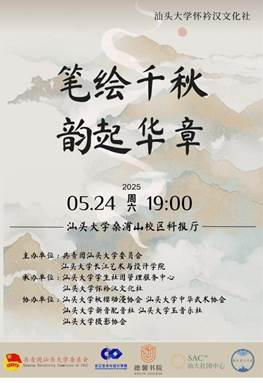 为了促进中华优秀传统文化在校园中传播与响应本次社团文化季“乘春日之风,展创新之翼”主题,展现青年在传承与发展中华优秀传统文化的热情与魅力,让广大汕大师生在校园中欣赏国风之美,怀衿汉文化社决定举办2024-2025学年春季学期汕头大学社团文化季系列活动之怀衿汉文化社“笔绘千秋·韵起华章”国风晚会,晚会具体事项如下: